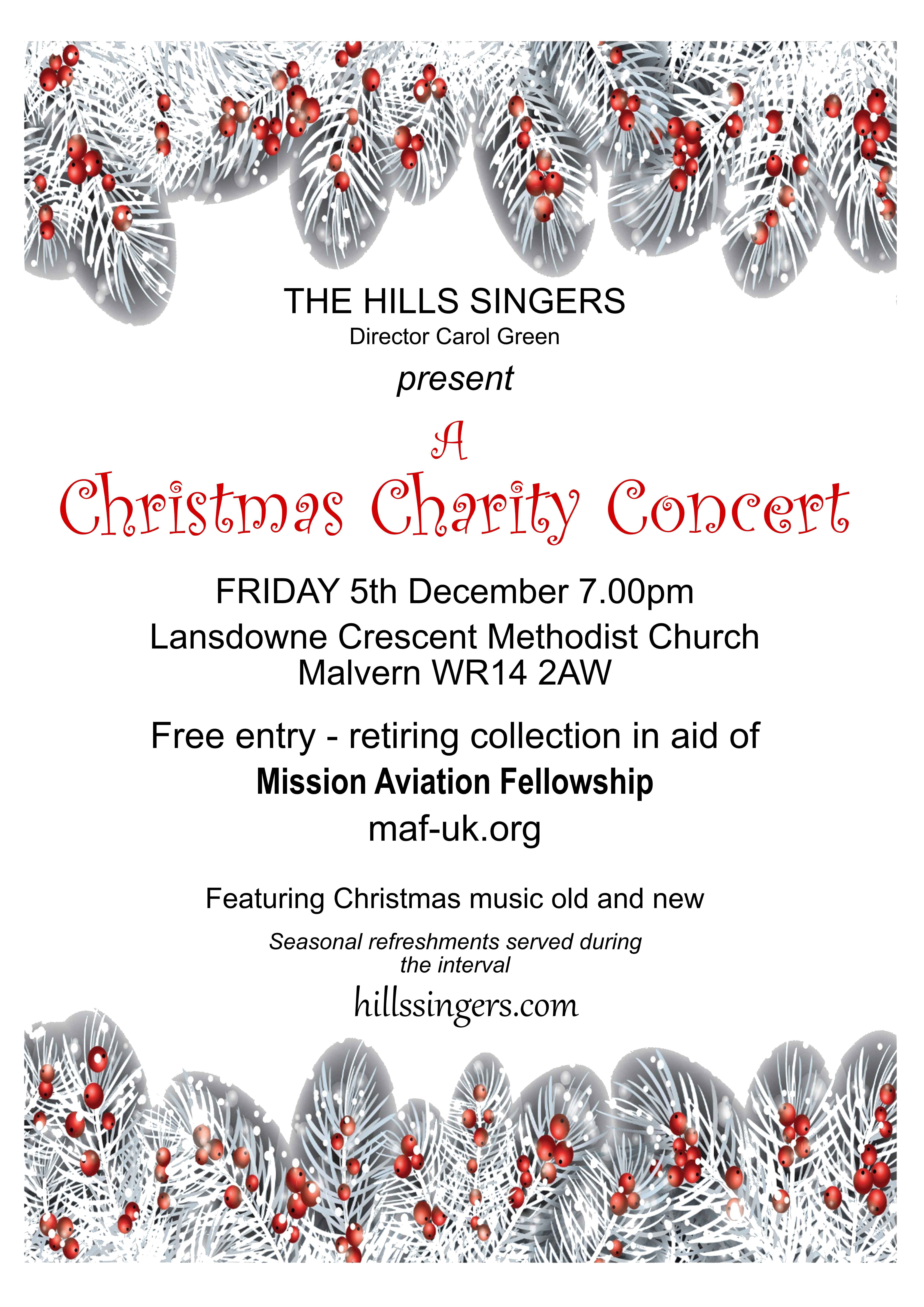Friday 5 December 2025 at 7 pm in Lansdowne Crescent Methodist Church, Lansdowne Crescent, Malvern WR14 2AW. This is a Charity Concert in aid of the Mission Aviation Fellowship. Admission is free, with a retiring collection. Light refreshments will be served in the interval.